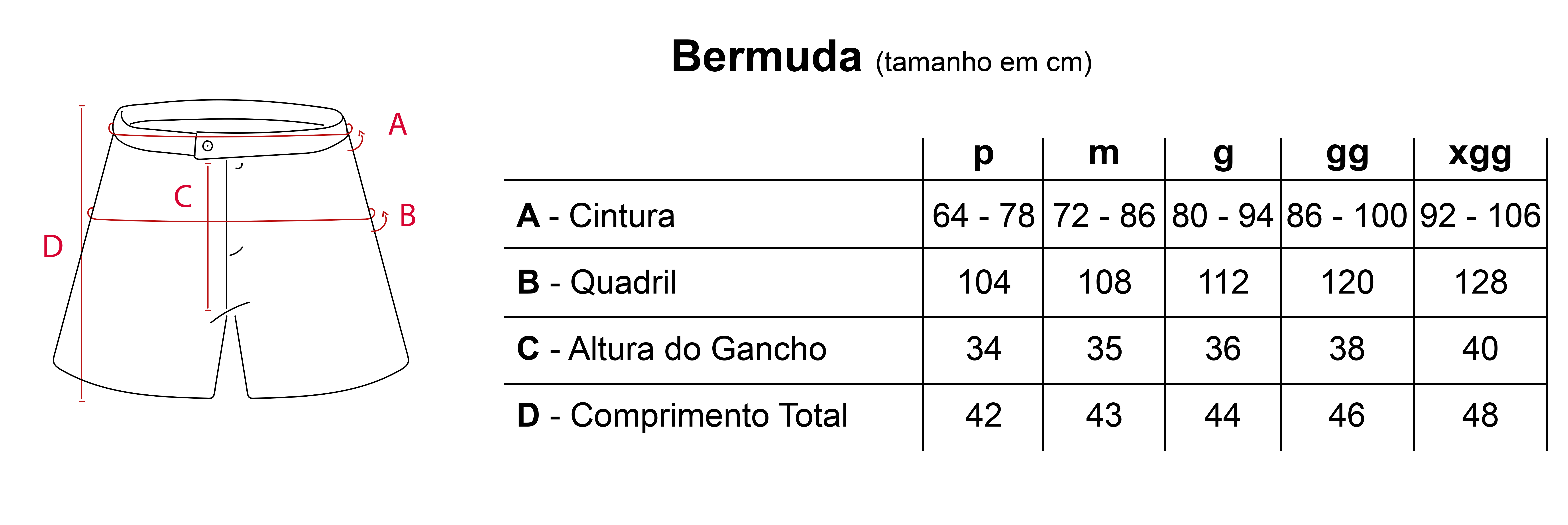 bermuda reta, com pregas, elástico nas costas e fecho em colchetes de metal. bolso faca na frente e bolso aparente atrás.